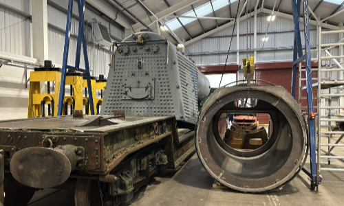 The boiler is the single largest component required for the engine at a cost of over £500,000 and was built at Dampflokwerk (Steam Locomotive Works) Meiningen, Germany. Following delivery, it is now housed inside the new Darlington Locomotive Works alongside the wheeled frames, locomotive’s tender and monobloc fabricated cylinder.