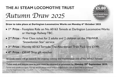 Terms and conditions apply. For full details please email enquiries@a1steam.com or send SAE to promotor. Charity Registration No. 1022834 Registered under Gambling Act 2005 with Darlington Borough Council.